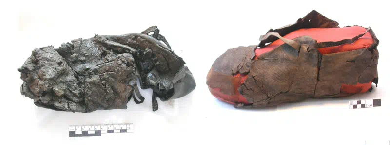 Henholdsvis før og efter konservering af vanddrukken, arkæologisk sko.