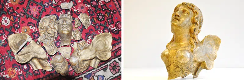 Henholdsvis før og efter konservering af forgyldt gipsfigur fra konsolbord.